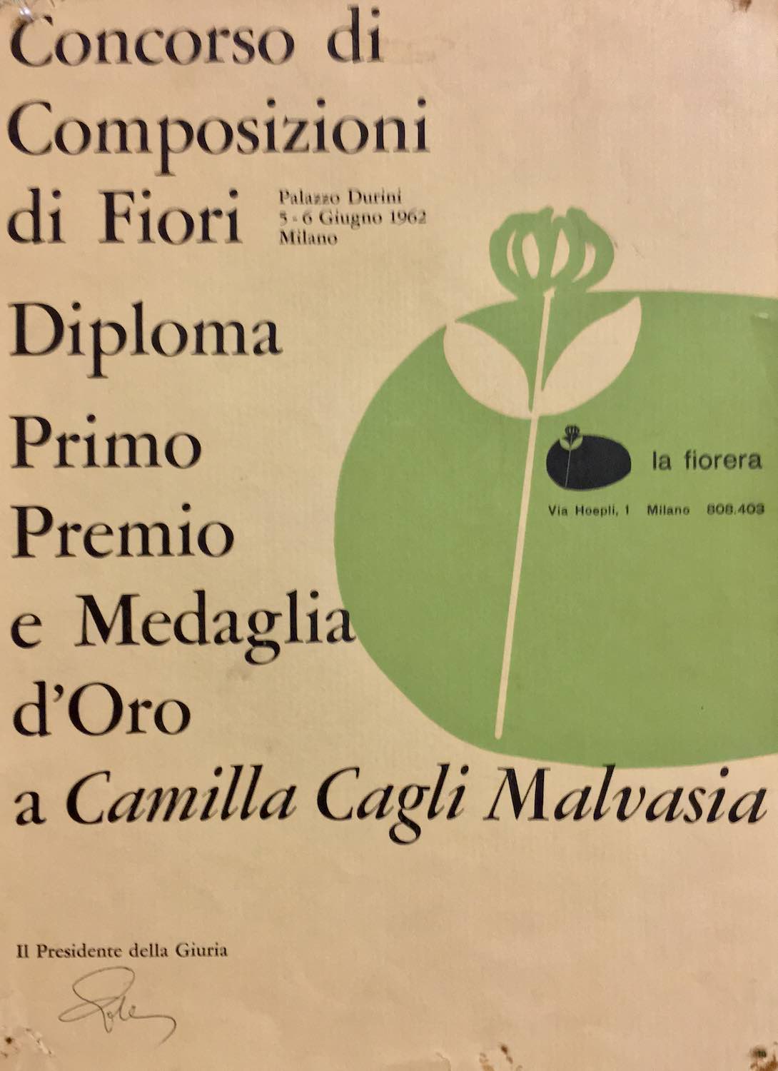 Diploma Camilla Malvasia Concorso Milano 1962
